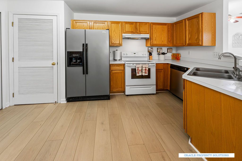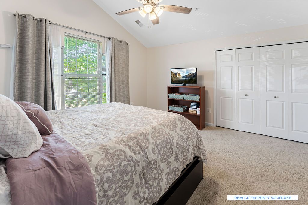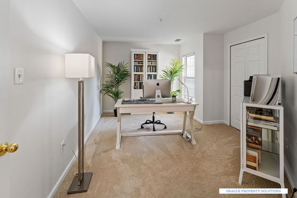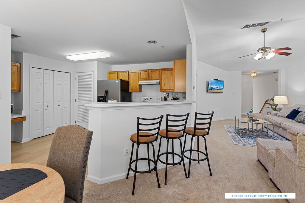 Large bedroom size (one can be used for an office space/den) with carpet flooring. The main bedroom features two walk in closets for ample space, leading to the full bath which houses a soaking tub/shower combo. The kitchen has modern updates allowing bar stool seating. Balcony offers plenty of privacy and room to enjoy the outdoor weather in all seasons. The laundry room area with storage is found towards the back of the kitchen. Everything you need on one level.